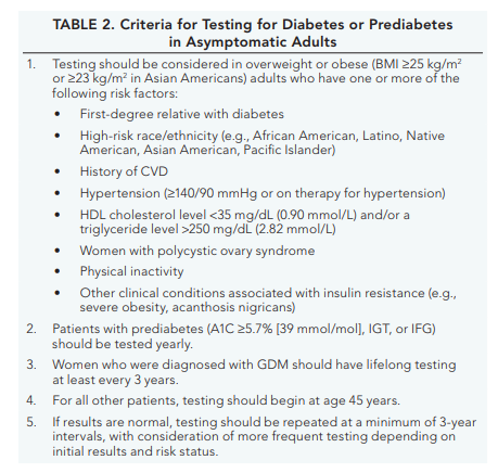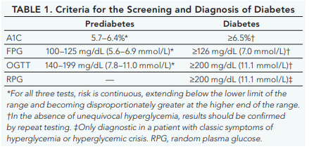 Diabetes and prediabetes may be screened based on plasma glucose criteria, either the fasting plasma glucose (FPG) or the 2-h plasma glucose (2-h PG) value during a 75-g oral glucose tolerance test (OGTT), or A1C criteria (Table 1).