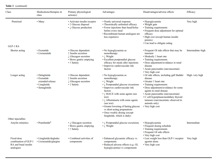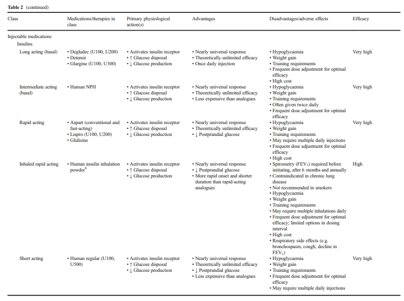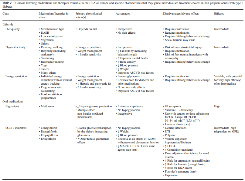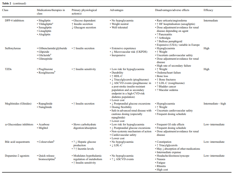 What follows is the outstanding Table 2 which well summarizes the entire article, Management of hyperglycaemia in type 2 diabetes, 2018. A consensus report by the American Diabetes Association (ADA) and the European Association for the Study of Diabetes (EASD) [PubMed Abstract] [Full Text HTML] [Full Text PDF]: