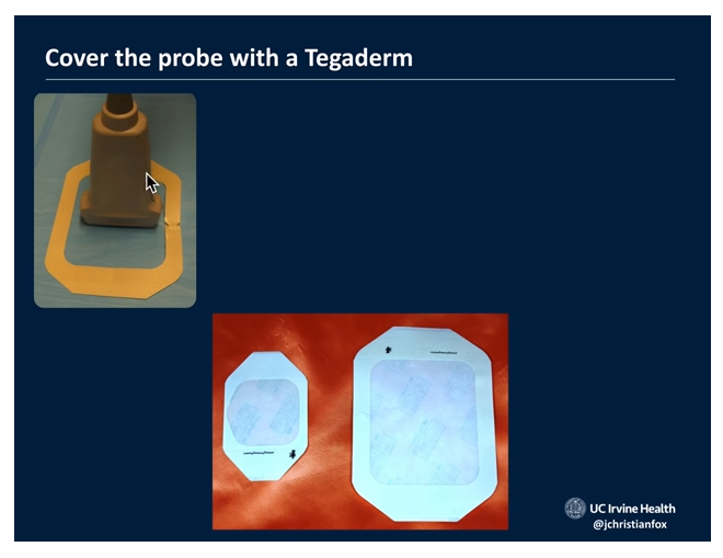 The image below is not completely correct because we don’t see a tegaderm sterile cover on the probe. And be sure that all the ultrasound gel is sterile and not from the usual non-sterile ultrasound gel bottle.