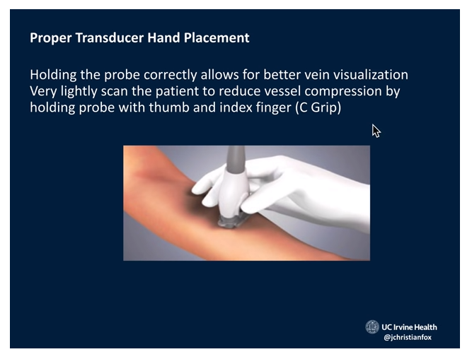 the blunt object [meaning the probe] in your non-dominant hand.[And] in this case the left hand is holding the probe with C grip [and] you’re stabilizing the probe on the patient’s skin and now you’re looking up in your field of vision over here somewhere is