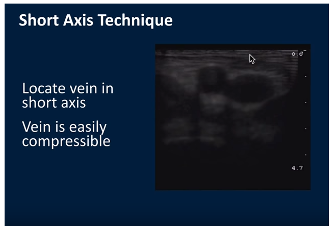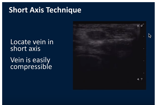 So now we’re moving on to how to cannulate the vein. First there is the short axis technique which is the technique that is recommended by the lecturer.
