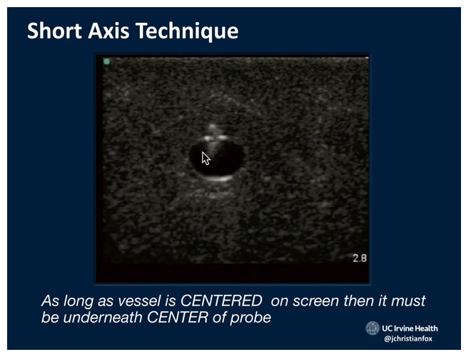 vessel is centered on the screen therefore it must be underneath the center of the probe so all you got to do is aim the needle underneath the center point of the transducers footprint – okay.