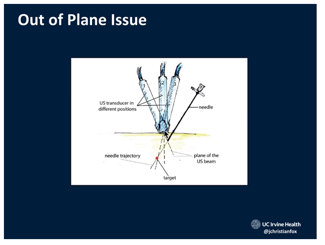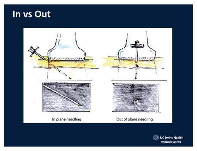 The nurses taught Dr. Fox, he says, to do the out of plane approach] we do this out of plane approach and then once we cannulate the vessel we then [can] rotate the transducer 90 degrees so that we can see the tip and shaft of the needle underneath the probe.