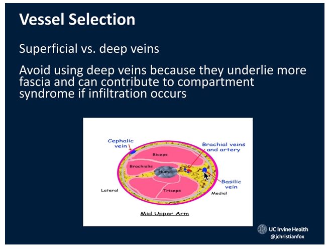 You want to put your IV in a superficial vein because there is less risk of complications. Save the basilic vein as a last resort, the author advises.