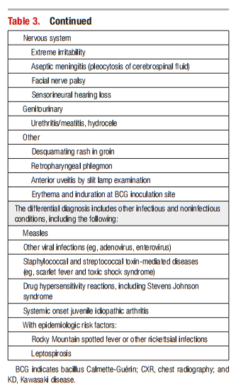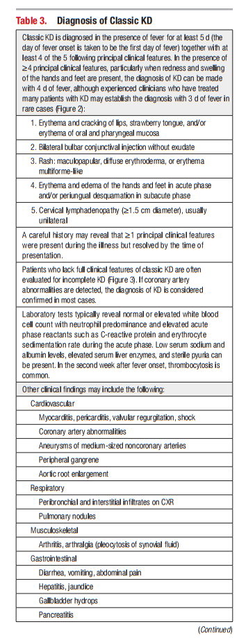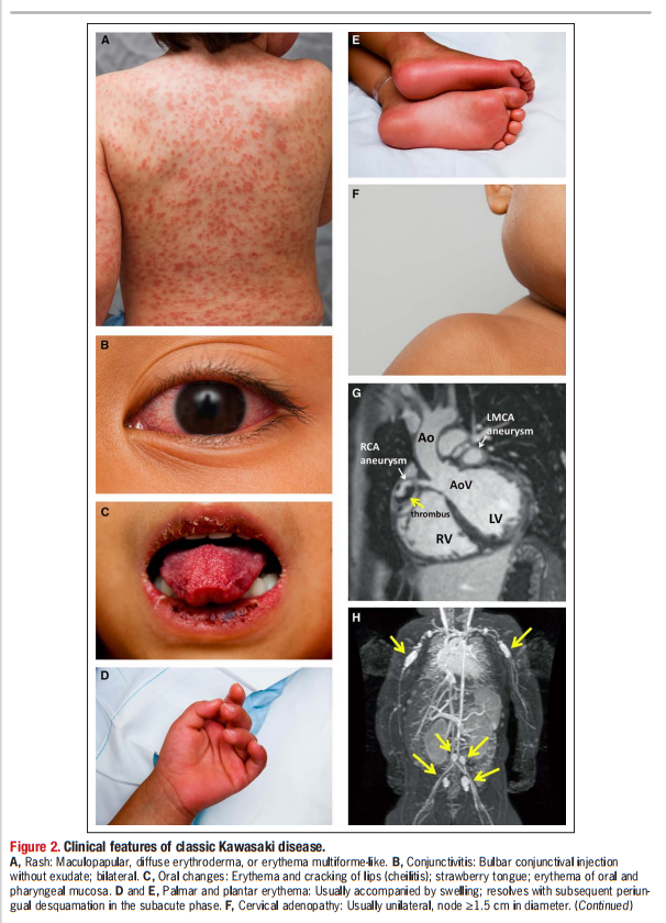 (1) Diagnosis, Treatment, and Long-Term Management of Kawasaki Disease: A Scientific Statement for Health Professionals From the American Heart Association [PubMed Abstract] [Full Text HTML] [Download Full Text PDF]. Circulation. 2017 Apr 25;135(17):e927-e999. doi: 10.1161/CIR.0000000000000484. Epub 2017 Mar 29.