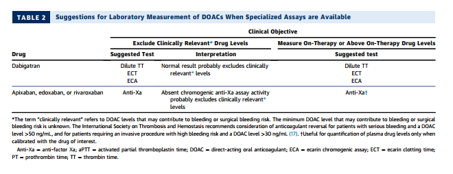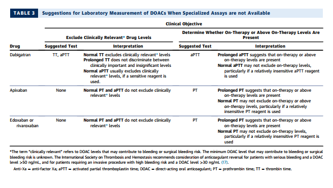 Laboratory measurement of the anticoagulant activity of the DOACs is more complex. The best assays are specialized and are not widely available. More accessible tests such as the PT and aPTT have important limitations. Suggestions for laboratory measurement of the DOACs based on specialized assay availability are summarized in Tables 2 and 3 (15,16).