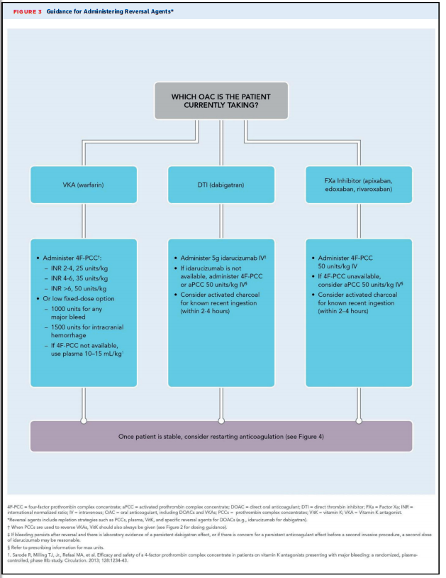 In a life-threatening or critical site bleed, or in situations in which bleeding cannot be controlled, reversal of OACs is required. This section provides information on the options available for reversal of VKAs, dabigatran, and Factor Xa inhibitors. Figure 3 provides guidance for administering reversal agents based on the OAC prescribed to the patient.