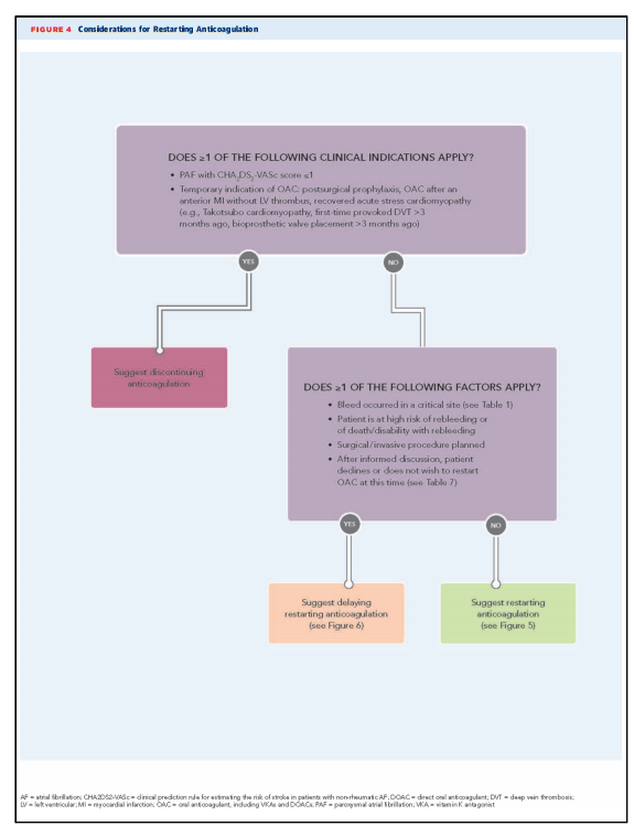 In most cases, there is net clinical benefit to restarting OAC after a bleeding event (85). After a patient has a bleeding event on OAC, the indication for OAC should be reassessed to determine whether continued therapy is warranted based on established clinical practice guidelines. The following are possible conditions for which OAC may no longer be indicated: n Paroxysmal atrial fibrillation with CHA2DS2-VASc score #1 n Temporary indication for OAC (e.g., postsurgical prophylaxis, OAC after an anterior myocardial infarction without left ventricular thrombus, recovered acute stress cardiomyopathy [e.g., Takotsubo cardiomyopathy], first time provoked venous thromboembolism >3 months ago, or bioprosthetic valve placement >3 months ago) (86)
