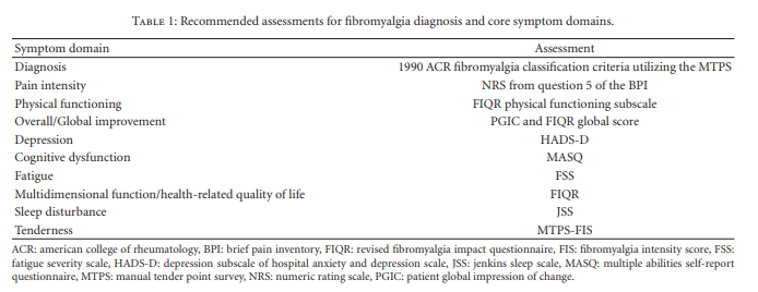 This post contains links to and excerpts from A comprehensive evaluation of standardized assessment tools in the diagnosis of fibromyalgia and in the assessment of fibromyalgia severity [PubMed Abstract] [Full Text HTML] [Full Text PDF]. Pain Res Treat 2012; 2012: 653714.