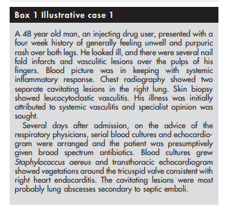 (see box 1).Several clinical and laboratory features are common to both vasculitis and infection. Constitutional symptoms such as fever, malaise, arthralgia, myalgia and weight loss, and laboratory features such as normocytic normochromic anaemia, peripheral blood leucocytosis, thrombocytosis, raised ESR, and CRP are encountered in both. Because treatment of vasculitis entails the use of immunosuppressive drugs, the consequences of not recognising infection would be disastrous. Thus, it is mandatory to perform a full and appropriate infection screen in all patients with suspected vasculitis especially those who present with systemic inflammatory features. It has been suggested that procalcitonin levels* are raised in patients with infection but not in those with non-infective inflammatory conditions,10 but this