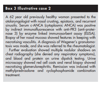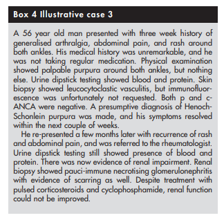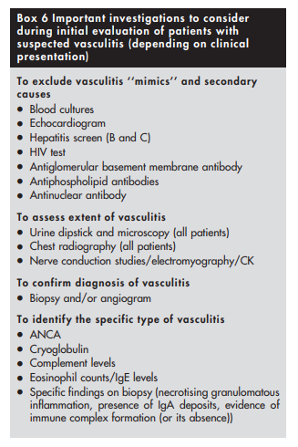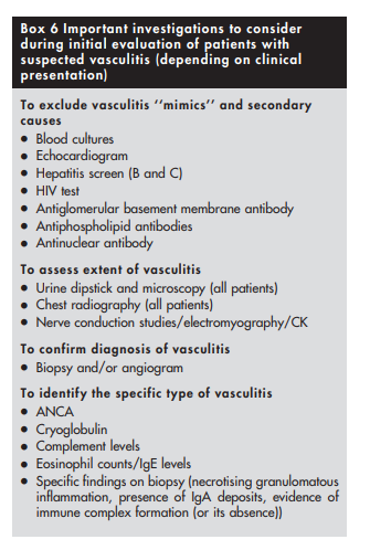 In summary, patients in whom vasculitis is suspected need detailed medical evaluation (box 6 above, near the beginning of this post). Because treatment of most primary forms of vasculitis consists of potentially toxic immunosuppressive therapy, exclusion of conditions that could mimic or cause vasculitis (especially infection and drug exposure) should take priority. Assessment of extent of disease, especially renal involvement, is equally important. Histological or radiological proof of vasculitis should be obtained, and where possible, the specific type of vasculitis should be identified. It is particularly important to recognise ANCA associated vasculitis in view of their poor prognosis and need for early treatment, but indiscriminate testing for ANCA in the absence of clinical evidence of vasculitis should be discouraged.