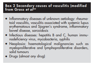 Because treatment of some forms of vasculitis such as those that are secondary to infection or drugs is different from that of primary vasculitis, it is important to exclude such conditions that are likely to cause secondary vasculitis (box 2).