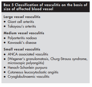 for patients with Henoch-Schonlein purpura44 45 (see box 4)The first step towards identifying the specific type of vasculitis is to categorise them according to the size of the affected vessel46 (see box 5 and table 1).
