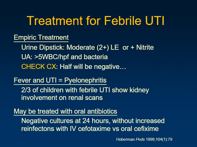 (5) Urinary tract infection: clinical practice guideline for the diagnosis and management of the initial UTI in febrile infants and children 2 to 24 months [PubMed Abstract] [Full Text HTML] [Full Text PDF]. Pediatrics. 2011 Sep;128(3):595-610. doi: 10.1542/peds.2011-1330. Epub 2011 Aug 28.