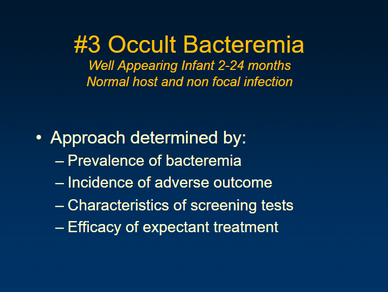 So here are some of the slides and lecture notes from Evaluation Of The Well Appearing Febrile Infant From CHOP – Part 4 Of 4 – 2 to 24 Months – Occult Bacteremia.