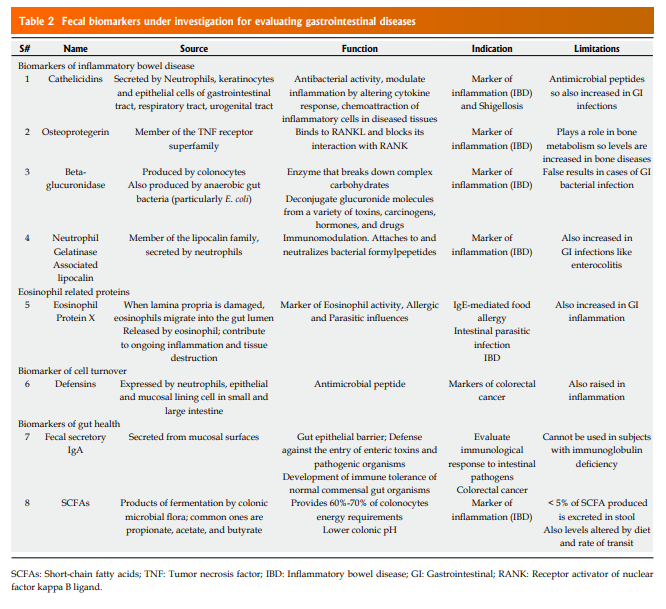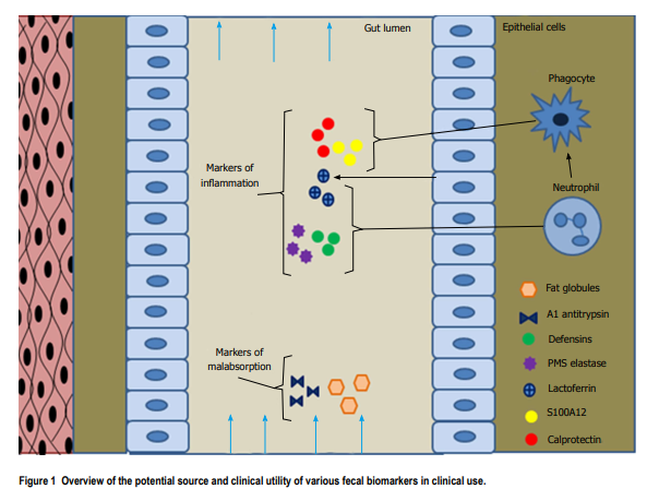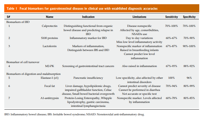 Here are excerpts from Resource (3), Update on clinical and research application of fecal biomarkers for gastrointestinal diseases (2017):