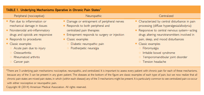 instance, the term centralized pain connotes the fact that in addition to the pain that might be caused by peripheral factors, there is superimposed pain augmentation occurring in the central nervous system. It is important to recognize this phenomenon (regardless of what term is used to describe it) because individuals with centralized pain do not respond nearly as well to treatments that work well for peripheral pain (surgery and opioids) and preferentially respond to centrally acting analgesics and nonpharmacologicaltherapies.