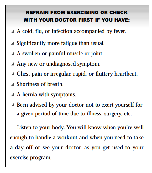 [Don’t exercise] if you’re not feeling well—if you think you might be getting sick, coming down with a cold or the flu; or if you have any kind of pain or swelling—take a break from exercising and, if necessary, contact your doctor.