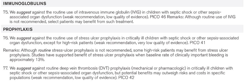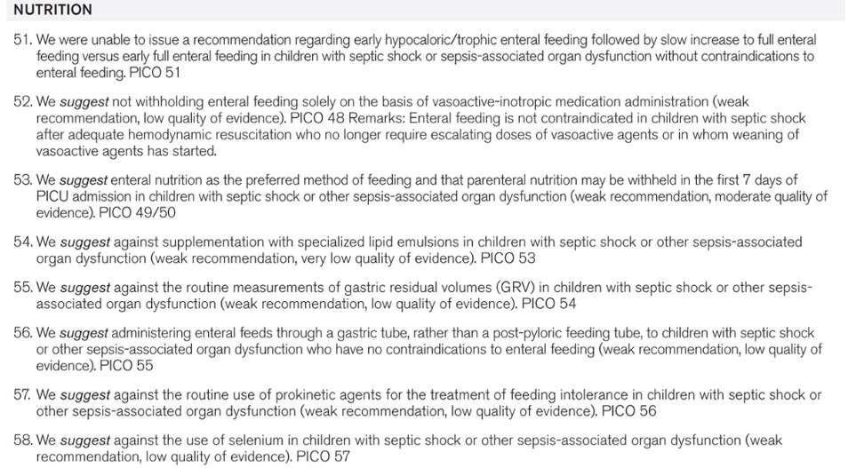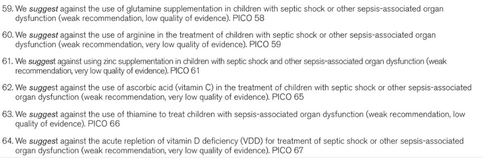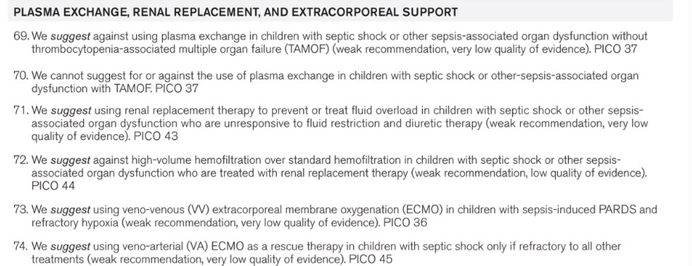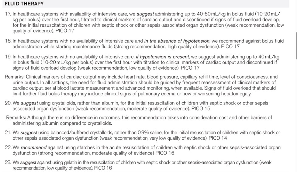 Conclusions: A large cohort of international experts was able to achieve consensus regarding many recommendations for the best care of children with sepsis, acknowledging that most aspects of care had relatively low quality of evidence resulting in the frequent issuance of weak recommendations. Despite this challenge, these recommendations regarding the management of children with septic shock and other sepsis-associated organ dysfunction provide a foundation for consistent care to improve outcomes and inform future research.