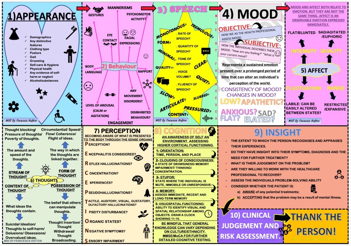 In addition to today’s resource, please see and review 10 Point Guide To Mental State Examination (MSE) In Psychiatry: (Click on the image below to enlarge the image)
