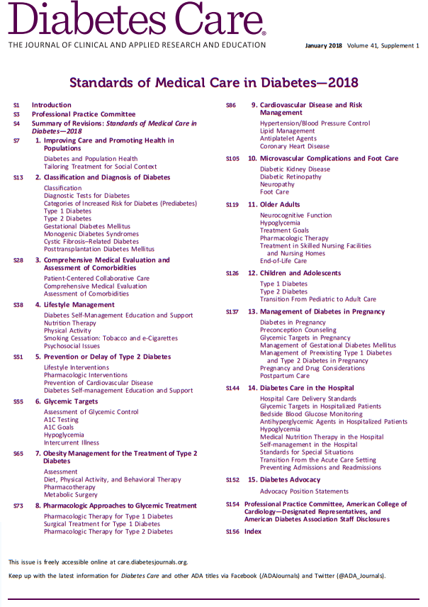 Here is the HTML link to The Table Of Contents of Standards Of Care In Diabetes – 2018. Use this link to go directly to the section of the standards that you need.