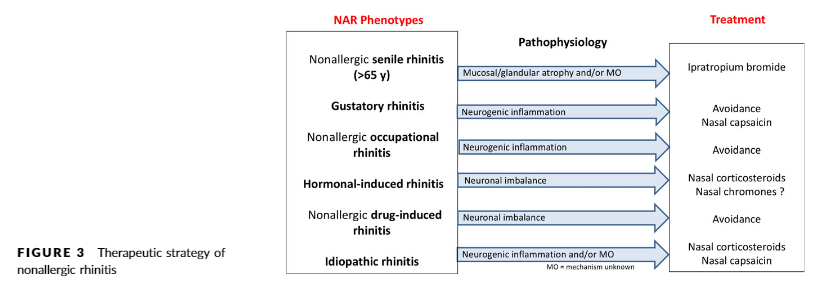 NAR patients constitute a group of patients with different pheno-types, with variable severity, underlying etiology and type of inflammation. The phenotypes warrant different treatment strategies depending on the etiology. However, most of the studies on treatment for NAR have been performed in unselected NAR patients. It makes sense to link the therapeutic strategy to the known or suspected underlaying etiology, being inflammation, neurogenic dysfunction, environmental exposure, and/or medication use (Figure 3).The inflammatory group (occupational rhinitis and drug-induced rhinitis) may benefit from anti-inflammatory treatment such as nasal/oral corticosteroids and/or nasal/oral antihistamines. However, mostRCTs evaluating local corticosteroids in NAR patients showed a lack of efficacy. Only two studies 57, 58 comprising 101 patients showed a positive outcome, whereas all other studies comprising more than 1000 patients did not show a major benefit of nasal corticosteroid treatment 59,60,61