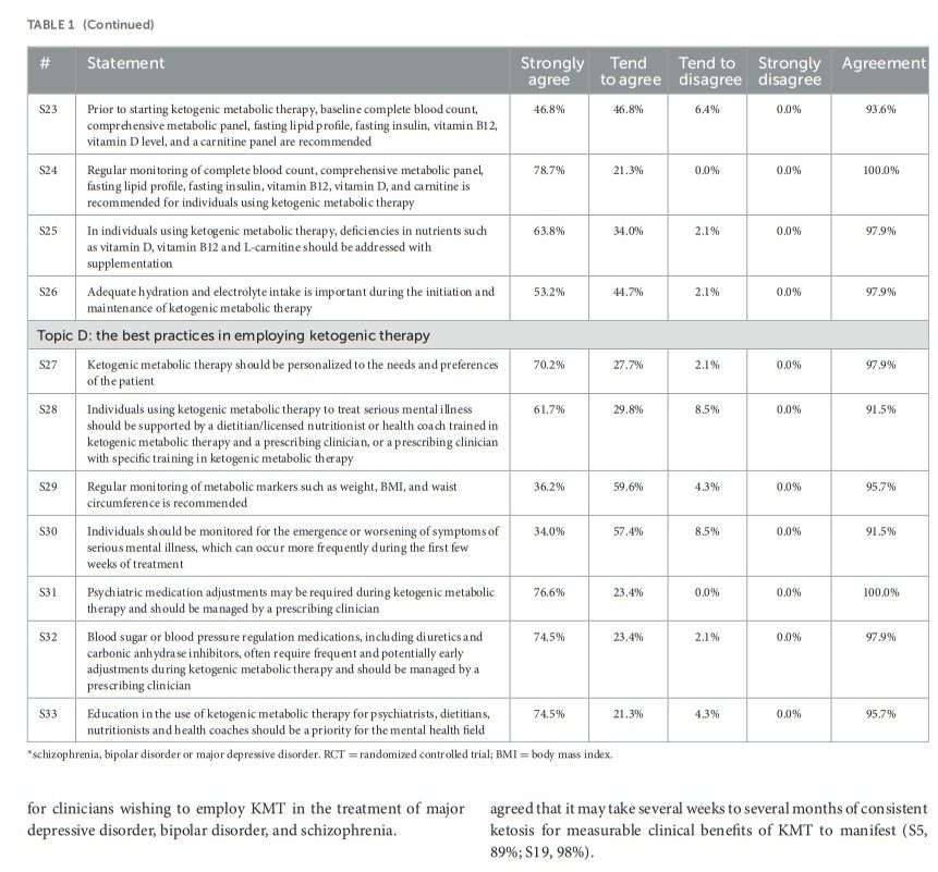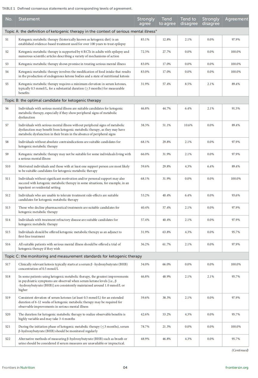 Respondents were aware of Level 1 evidence supporting the use of KMT in epilepsy (S1, 98%; S2, 100%) and agreed that there is clear potential for use in serious mental illness (S3, 100%). Respondents agreed that clinically relevant ketosis begins at 0.5 mmol/L beta-hydroxybutyrate (BHB), but that many individuals may require BHB levels of 1.0 mmol/L or higher for best outcomes (S5, 89%). Clinical response times are highly variable; respondents agreed that it may take several weeks to several months of consistent ketosis for measurable clinical benefits of KMT to manifest (S5, 89%; S19, 98%).