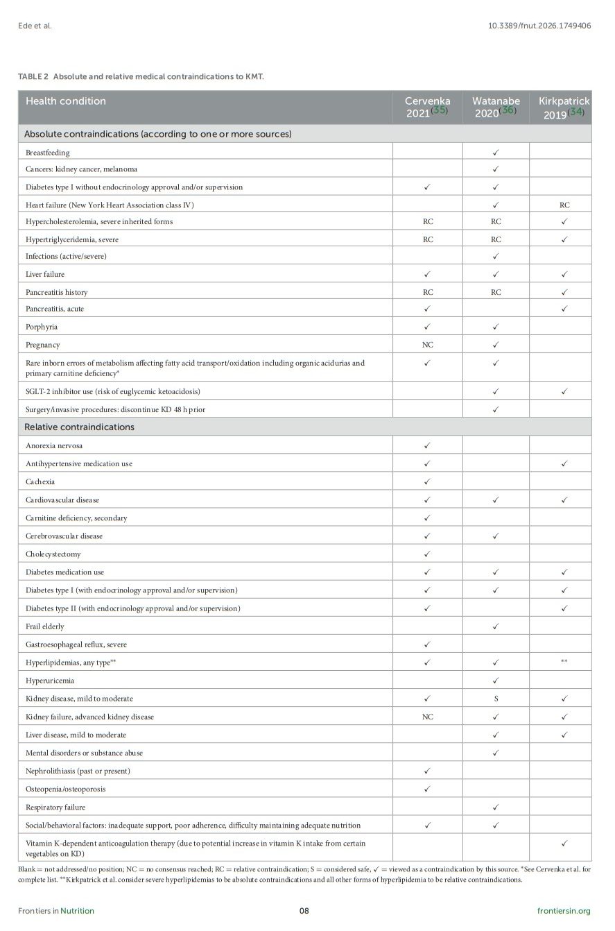 Table 2 lists medical conditions viewed as absolute and relative contraindications to KMT according to three recent authoritative reviews (34–36). Expert opinions vary, most notably with respect to severe hypertriglyceridemia and hypercholesterolemia, which are viewed as absolute contraindications by the National Lipid Association (34) but as relative contraindications by other sources. Although there is mounting evidence that elevated LDL cholesterol does not pose a direct risk to cardiovascular health (37–40), the authors recommend caution in these cases, as the elevations in LDL cholesterol that sometimes accompany carbohydrate restriction could exacerbate pre-existing dyslipidemias.
