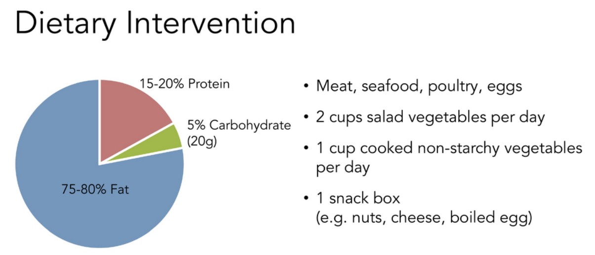 This was the dietary intervention, a modified ketogenic diet based on whole foods, meat, seafood, poultry, eggs, some vegetables cooked and raw, and one keto-friendly snack per day. The diet was 75- 80% fat, 15 to 20% protein, and 5% carbohydrate – about 20 grams of carbohydrate per day.