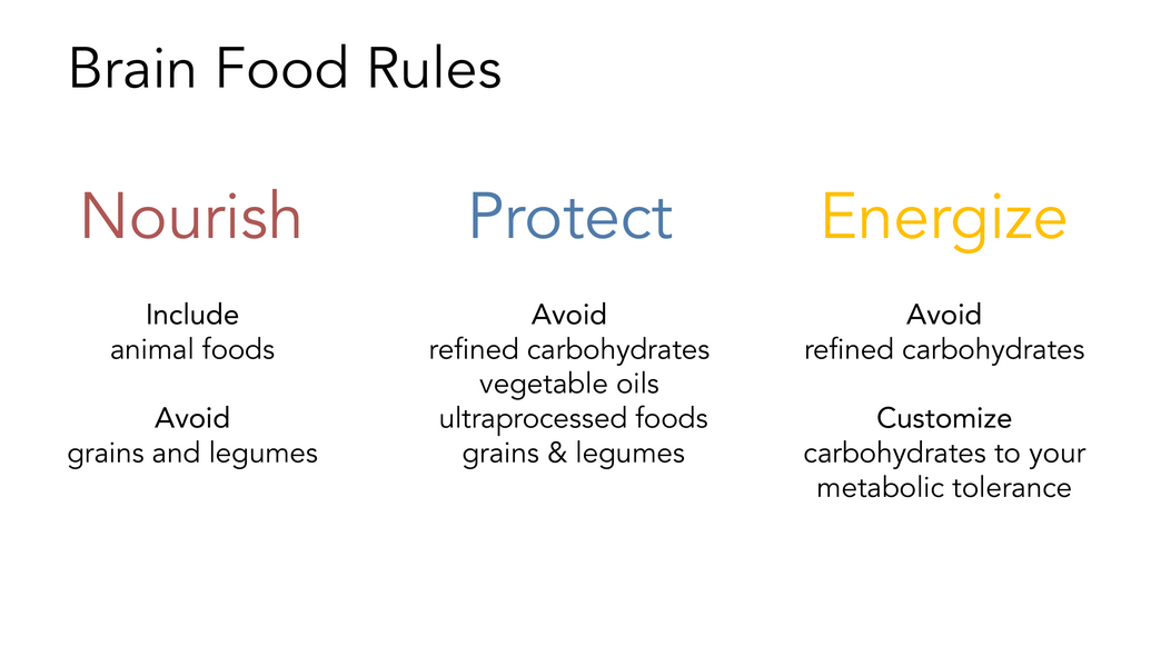 Now we want to create a set of brain food rules that make biological sense. To summarize how best to nourish the brain, include some animal foods and avoid grains and legumes. To protect the brain, avoid refined carbohydrates, vegetable oils, and ultra-processed foods. To energize the brain, keep your blood sugar and insulin levels in a healthy range. To accomplish that, depending on how metabolically healthy or unhealthy you are, maybe all you have to do is avoid refined carbohydrates. But for many of us, we will need to reduce our overall carbohydrate intake because we no longer process carbohydrates properly. That might mean eating a low glycemic index diet, a moderately low carbohydrate diet, or a ketogenic diet.