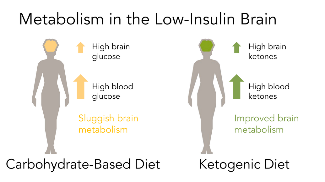 The reason why metabolic psychiatrists like myself focus on the ketogenic diet is because insulin resistance and high insulin levels can be targeted beautifully with a ketogenic diet. In addition, a ketogenic diet leads to high levels of blood ketones. Ketones easily cross the blood-brain barrier and can be used by the brain as fuel, even in the setting of severe insulin resistance. The more ketones you have in the blood, the more that will enter the brain to help bridge the energy gap left by cerebral glucose hypometabolism.