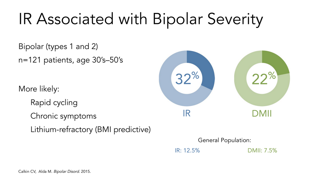 Some of the best information we have that points to a causal relationship comes from Dr. Cynthia Calkin, a metabolic psychiatrist specializing in bipolar disorder at Dalhousie University in Nova Scotia. She’s found that her patients with bipolar disorder are 3x more likely to have insulin resistance or type 2 diabetes. In those same patients, those with insulin resistance or type two diabetes and bipolar disorder are more likely to have rapid-cycling mood. They’re also more likely to have chronic symptoms and less likely to respond to the mood-stabilizing drug lithium.