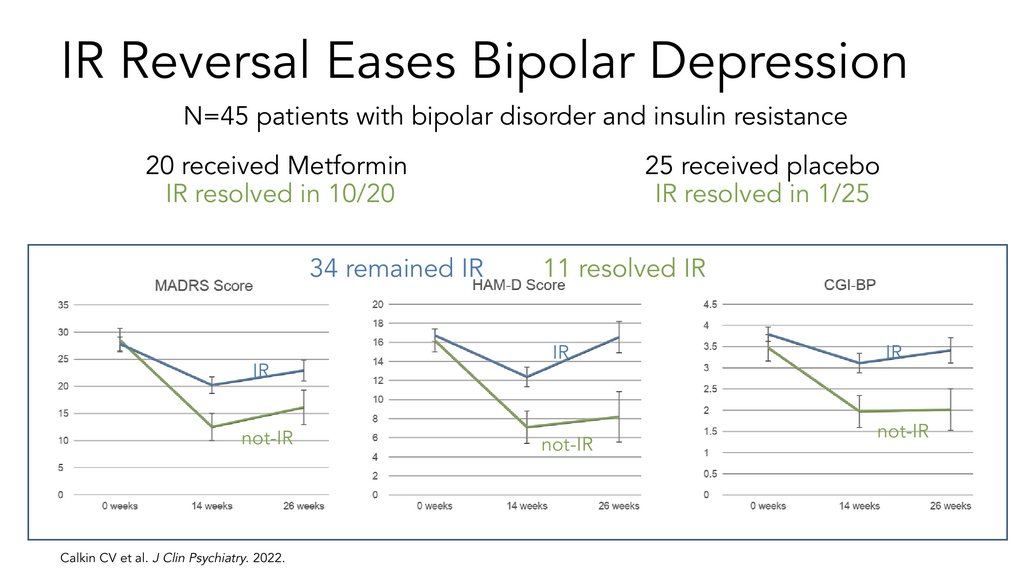 She went one step further and supported this very well with a meticulously conducted, quadruple-masked, randomized controlled trial. She tested treating insulin resistance with medication to see what would happen to mood. Dr. Calkin used metformin, a common generic medication for type 2 diabetes, which works in part by improving insulin resistance. She found that the subjects with the greatest improvements in insulin resistance were the same patients who had substantial reductions in their depression symptoms. In subjects with no change in their insulin resistance, there was virtually no change in depression symptoms.