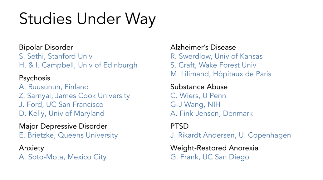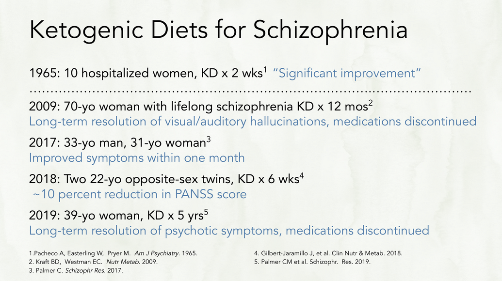 I want to briefly walk you through the scientific evidence for the use of ketogenic diets in various psychiatric conditions. There have been six case reports published in the literature, largely thanks to Dr. Chris Palmer, of patients with schizophrenia improving on a ketogenic diet. In two cases, patients achieved long standing resolution of symptoms with the ability to completely discontinue antipsychotic medications, which is just remarkable.