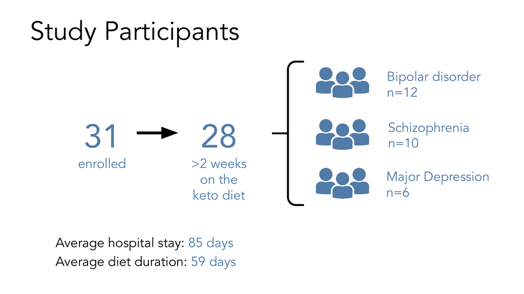 Of the 31 patients, 28 of them adhered to the diet long enough for us to analyze the results – at least two weeks. 12 patients had bipolar disorder, 10 patients had schizophrenia, and 6 had major depression.