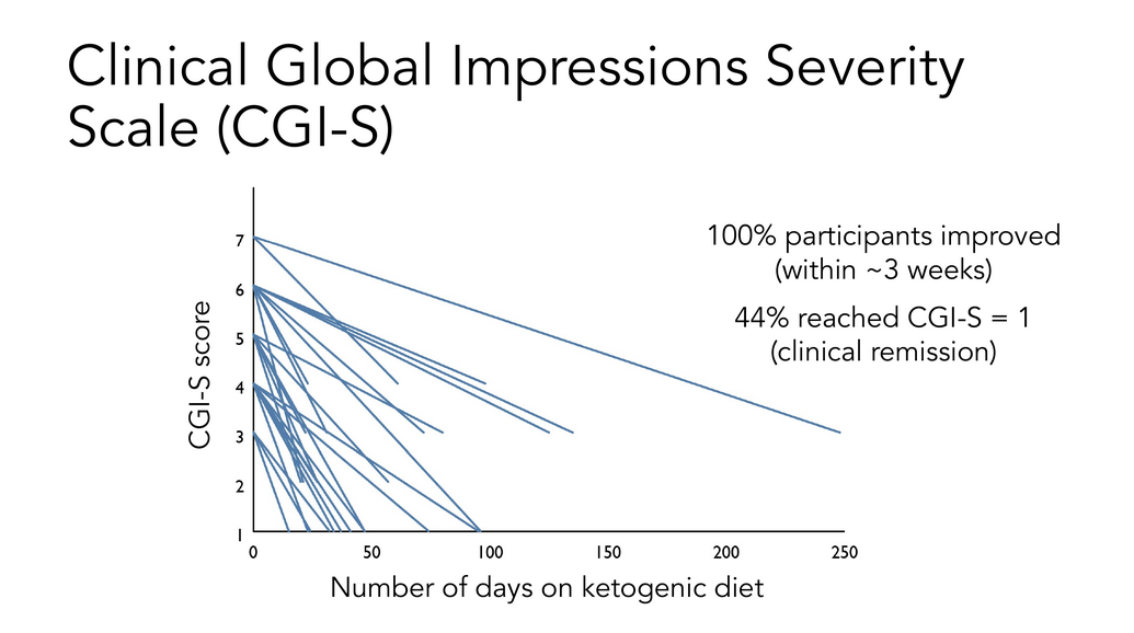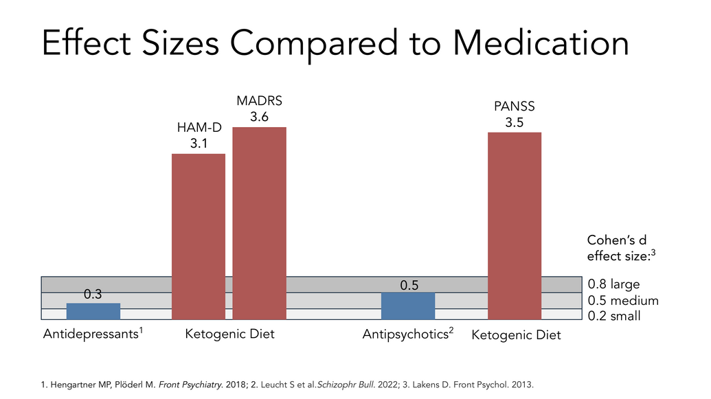 To give you a sense of how dramatic these reductions were: In order for a pharmaceutical company to claim that their medication works, they have to describe something called the “effect size,” or “Cohen’s d effect size.” A typical antidepressant trial will show a Cohen’s d of about 0.3, which is considered a small effect. Antipsychotics fare a little better in randomized controlled trials, with a medium Cohen’s d effect of about 0.5. The ketogenic diet in Dr. Danan’s hands was 10x more effective, not a subtle difference.