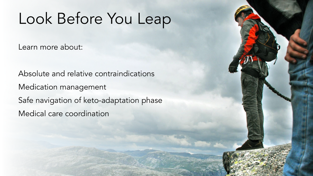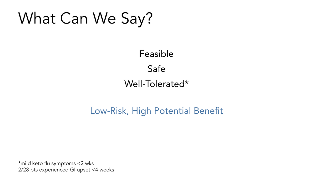 If you’re going to use a ketogenic diet in clinical practice, there are some things you need to be aware of to use these diets safely. There are a few contraindications, including things like underweight, anorexia, pregnancy, and SGLT-2 inhibitors.* There are many blood glucose, blood pressure, and psychiatric medications that often need to be adjusted/weaned on a ketogenic diet, and this can be tricky. You also have to safely navigate the keto adaptation phase** in the first couple of weeks of the diet; a lot of this can be mitigated or avoided by easing into the diet slowly rather than starting it all at once.