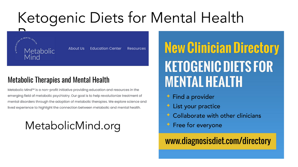 There are many resources now for additional information. At the Baszucki Group’s metabolicmind.org, Dr. Brett Scher has some wonderful interviews with researchers, clinicians, families, and patients. There is a lot of free information there. It can be hard to find clinicians who offer these services; please help me grow the free directory on my website, diagnosis.com. It’s free to post your practice there so people can network and find practitioners who use ketogenic diets specifically to treat mental health conditions.