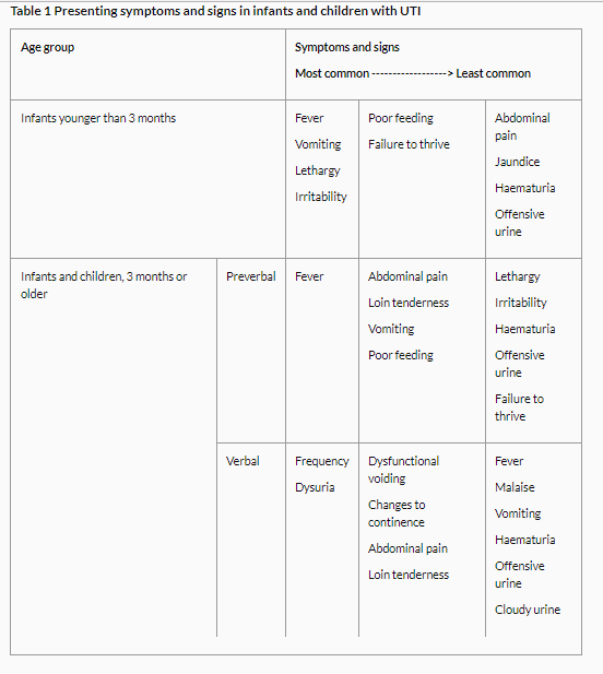 - Table 1 Presenting symptoms and signs in infants and children with UTI [Link is to page 5 on this post]