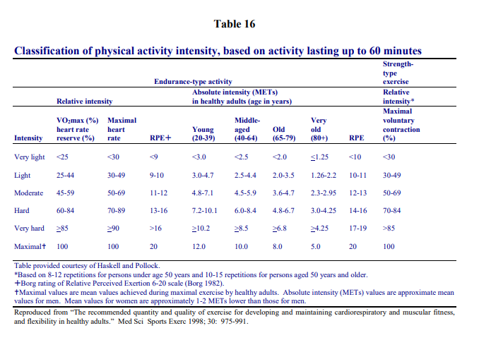 Intensity can also be judged as a rating of perceived exertion (RPE), which can be equated to desirable heart rate during individual activities. The original scale introduced by Borg
