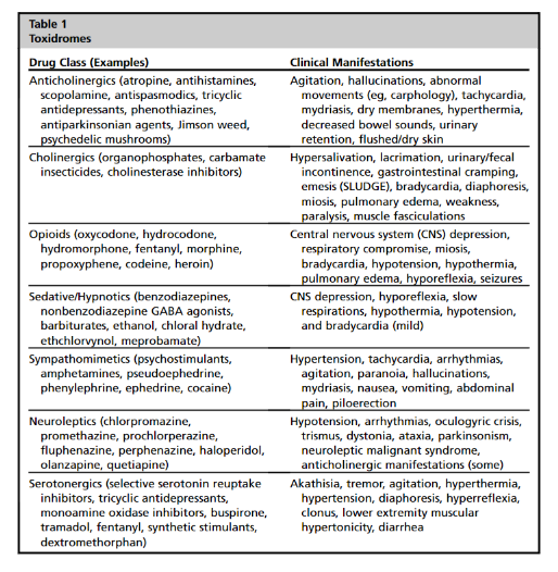 Resource (1) below, Assessment and Management of Toxidromes in the Critical Care Unit [PubMed Abstract] [Full Text HTML] . Crit Care Clin. 2017 Jul;33(3):521-541, well summarizes the following toxidromes: