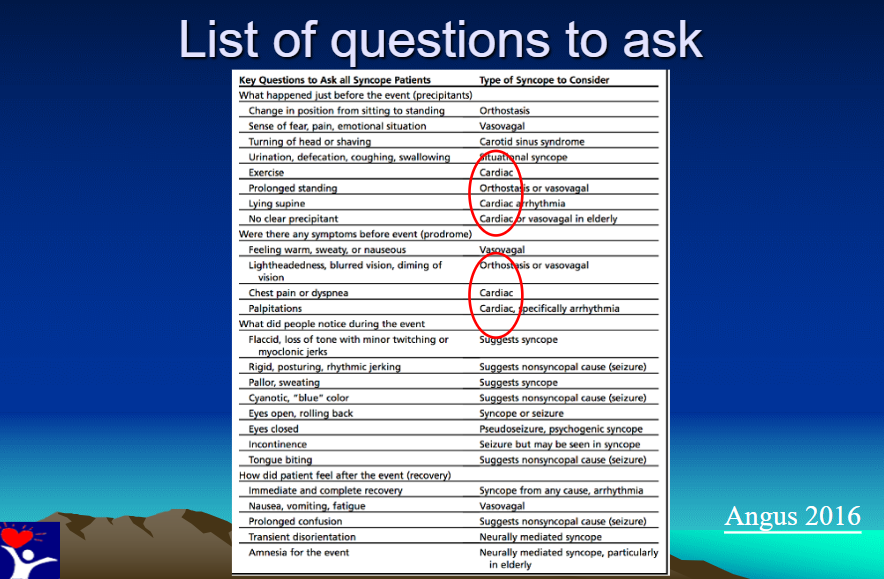 Here is Dr. Iyer’s slide with the questions you should ask the syncope patient:
