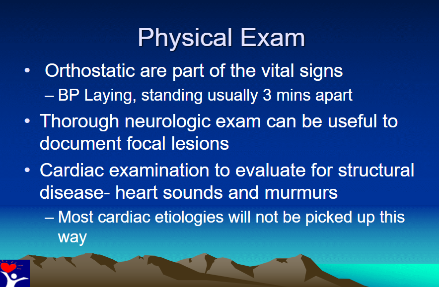 - Careful physical exam including orthostatic vitals, cardiac auscultation, and neurologic evaluation.