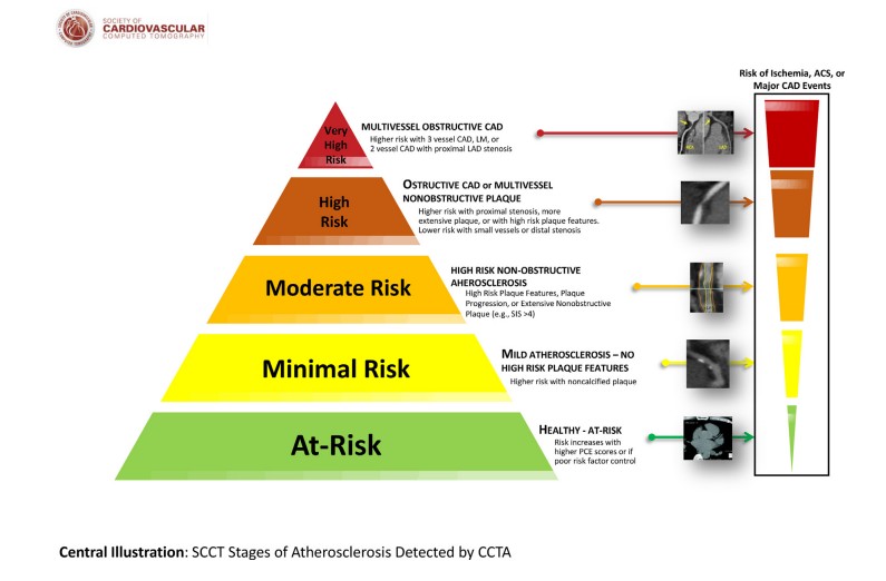 obstructive CAD by CCTA guide clinical decision making for secondary prevention including consideration of coronary revascularization. However, atherosclerosis is the primary disease process that mediates risk and stenosis is just one of its many subsets. Importantly, for risk assessment, patients with more extensive, multivessel CAD are at highest risk while those without any plaqueor stenosis comprise those at lowest risk (Central Illustration).This document focuses on the presence and extent of atherosclerotic plaque that elevates risk above that of patients