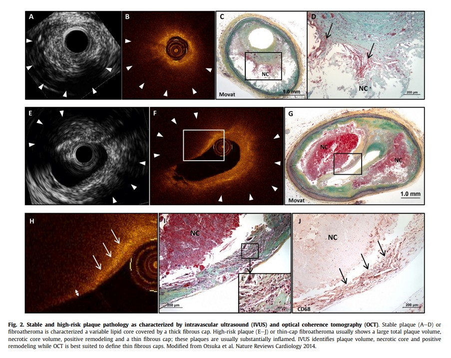Some of these features have been identified using invasive imaging methods, including intravascular ultrasound (IVUS),31 optical coherence tomography (OCT)32 and near-infrared spectroscopy in patients with acute coronary syndromes. Each of these methods has its own limitations in providing a comprehensive picture of the vessel wall, extent of atheroma burden across the entire tree and stenosis.33 Fig. 2 depicts examples of stable and high-risk plaquepathology as characterized by IVUS and OCT.With the exception of the thin cap, these features of TCFA (i.e.,