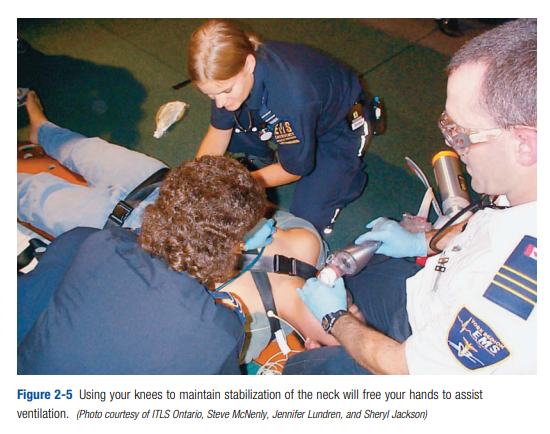 emergency care provider 2 should begin to assist ventilation immediately using his or her knees to restrict movement of the patient’s neck, which will free his hands to apply oxygen or use a bag-valve mask to assist ventilation (Figure 2-5).