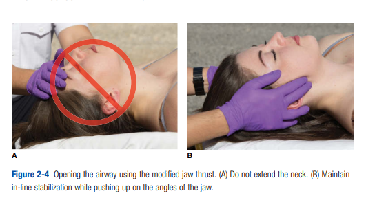 If the patient cannot speak or is unconscious, further evaluation of the airway should follow. Look, listen, and feel for movement of air. Emergency care provider 2 should position the airway as needed. Because of the ever-present danger of spine injury, avoid extending the neck to open the airway of a trauma patient. If the airway is obstructed (apnea, snoring, gurgling, stridor), use an appropriate method (reposition, sweep, suction) to open it immediately (Figure 2-4). Failure to quickly provide