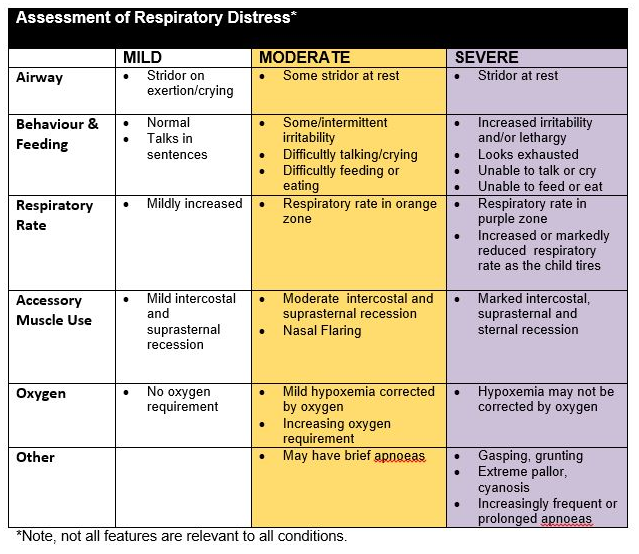 Respiratory distress should be recorded as Nil, Mild, Moderate or Severe and be determined by assessing the following features (see www.victor.org.au)