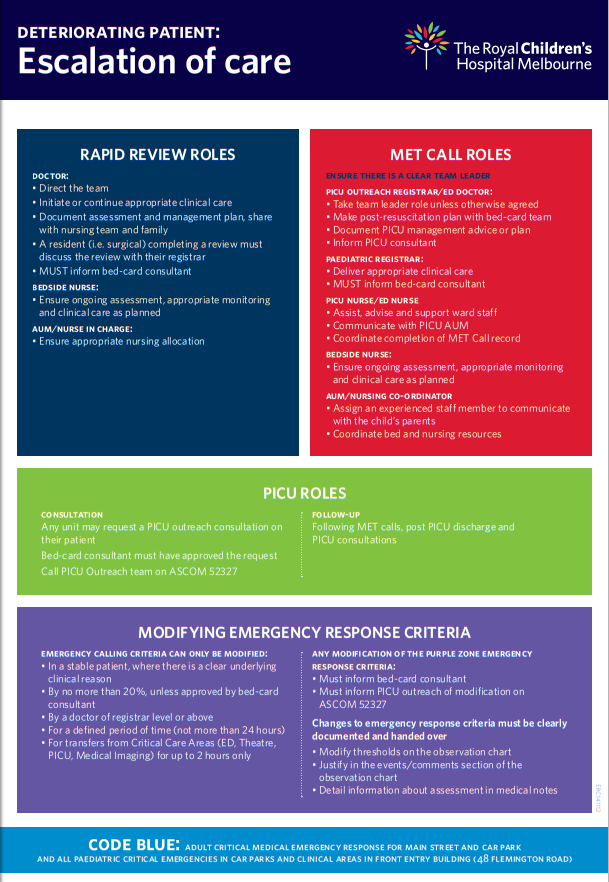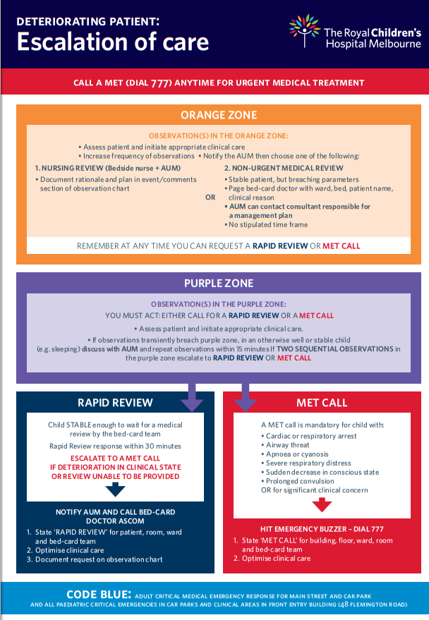 (4) Deteriorating Patients: Escalation of Care from The Royal Children’s Hospital of Melbourne. The link is to two page resource on when to call for a rapid response team.